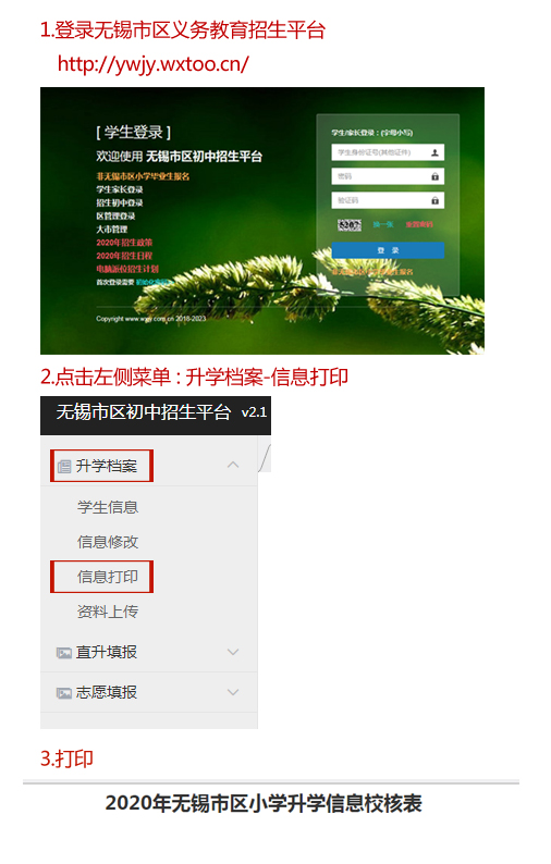 2.7月4日上午8点起,学生由一位家长陪同进校(请戴好口罩)。学生请勿携带手机等电子类产品进校。进入校门时,请家长出示手机上的短信,学生手持已打印的《2020无锡市区小学升学信息校核表》(信息校核表打印方式见下图)。