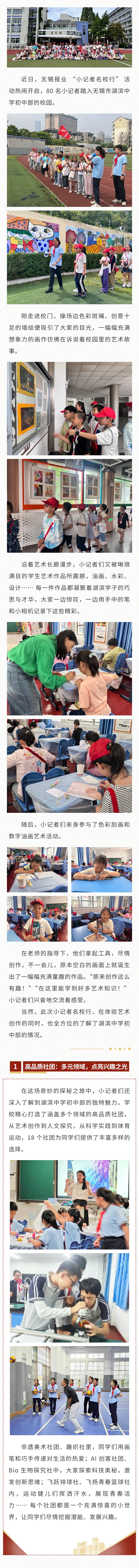 通过这次 “小记者名校行” 活动,大家深深感受到beat365中国唯一官网初中部是一片孕育艺术梦想、助力全面成长的沃土。这里有丰富的课程、多彩的活动、优秀的老师,还有充满活力与创造力的学习氛围。相信未来,会有更多无锡的小学生走进湖滨中学,在这里绽放属于自己的精彩!