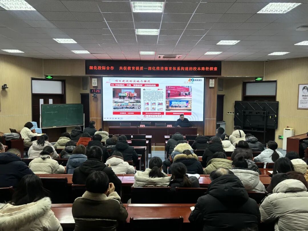 副校长赵龙以《深入推进德育体系构建的校本路径探索》为题,面向连云港外国语学校全体班主任及德育管理团队作专题讲座。他通过典型案例分享与实操方法指导,为对方德育工作的深化开展提供了宝贵借鉴。