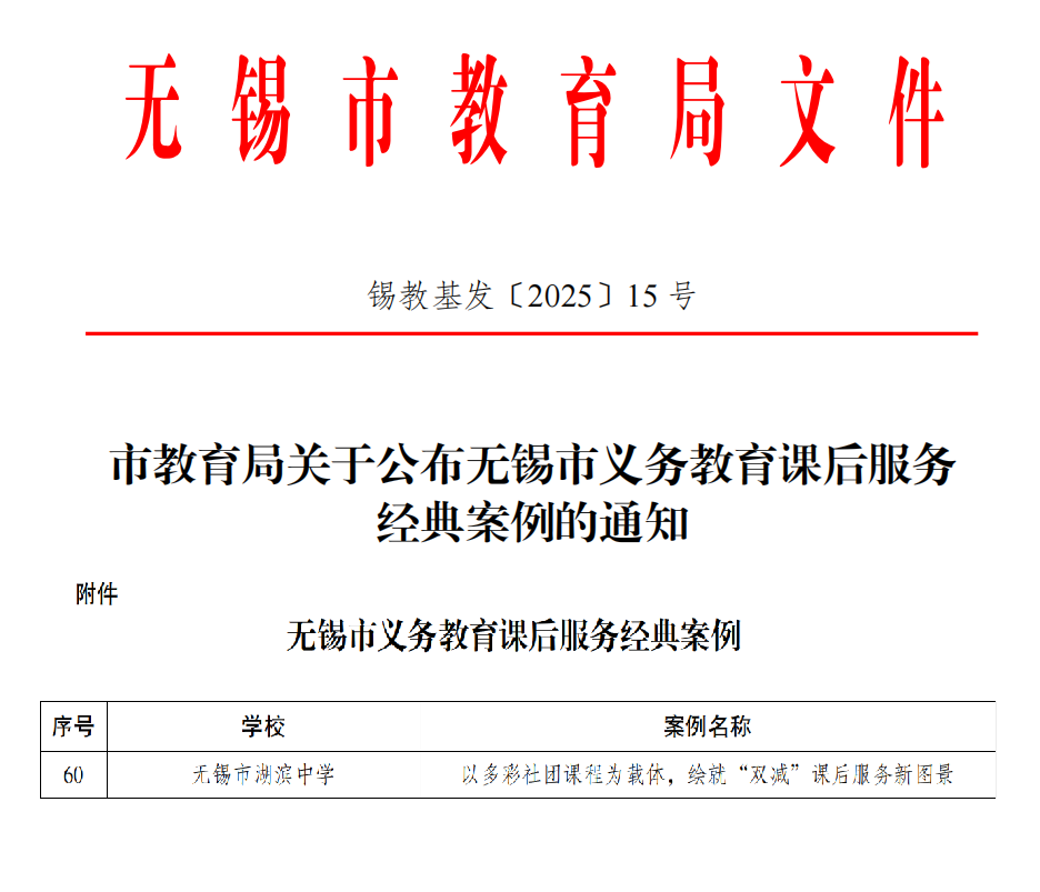 近日,beat365中国唯一官网初中部喜报传来:《以多彩社团课程为载体,绘就“双减”课后服务新图景》案例成功入选无锡市义务教育课后服务经典案例!