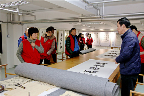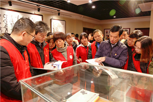 铃兰实验幼儿园、梨庄社区党员同志在湖滨中学过健校长的陪同下参观湖滨中学美术特色办学40周年师生书画作品展