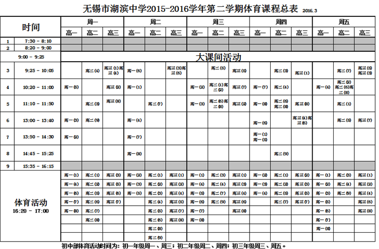 2015-2016学年第二学期体育课程总表(3月20日起)