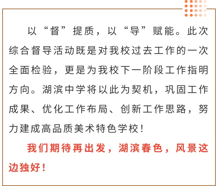 他们走进美展厅,感受湖滨40余年美术教育的积淀,走进大学美术专业先修课程基地,感受美术特色教育的丰富内涵……每一个空间都是学生成长的舞台,每一个空间都绽放着怡美文化独有的样态。督导组对学校校园文化环境的建设给予了高度肯定。