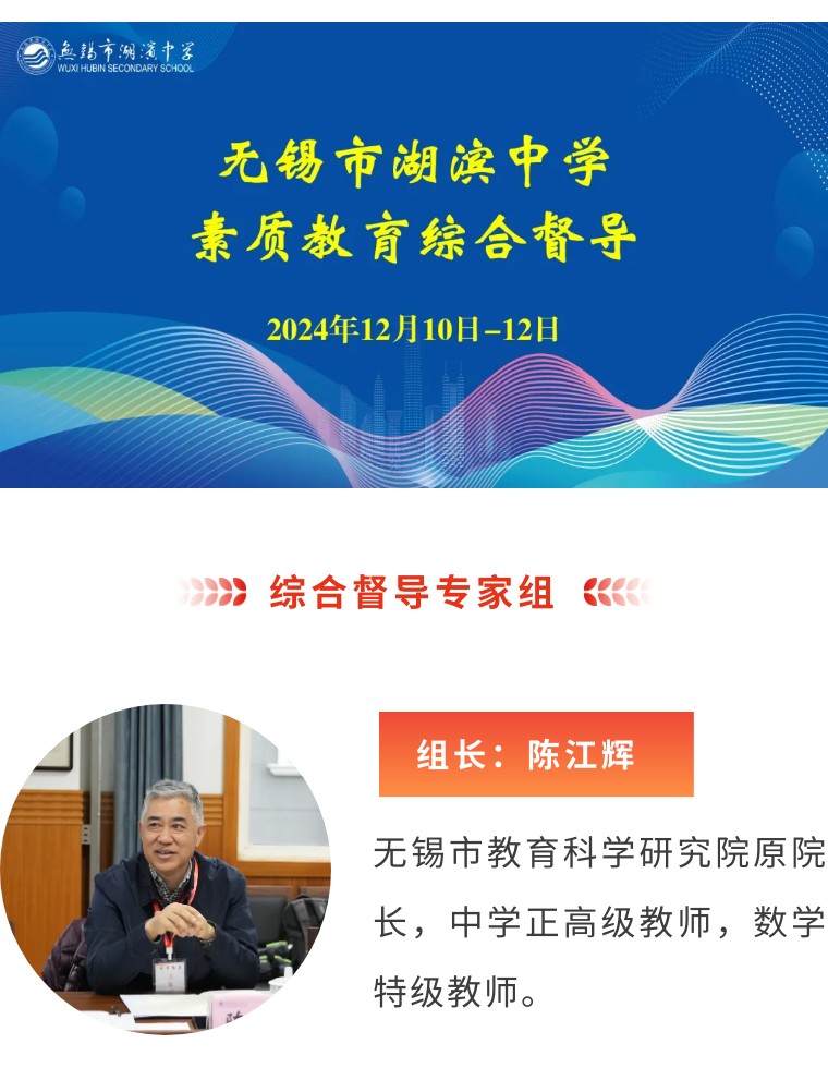 为切实优化学校办学水平,提升学校内涵品质发展,2024年12月10日——12日,无锡市教育局组织专家组对beat365中国唯一官网开展为期三天的素质教育综合督导。本次综合督导组由6位专家组成,原无锡市教育科学研究院院长陈江辉担任组长,围绕“办学方向、立德树人、教学工作、队伍建设、资源保障、示范引领”六个方面进行综合督导评估。