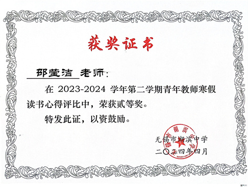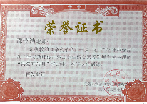 邱洁,上海师范大学教育硕士。任教20年来,班主任工作长达16年,在担任班主任工作踏实认真,能积极和学生沟通并给与正确指导。所带班级成绩优异,多次被评为市先进班集体或市五四优秀团支部。所带高中部毕业班中多名学生升入清华美院、浙江大学、东南大学、上海华东理工大学等重点高等学府。所带初中部毕业班中多名学生被天一、省锡中、一中、辅仁等重点高中录取。