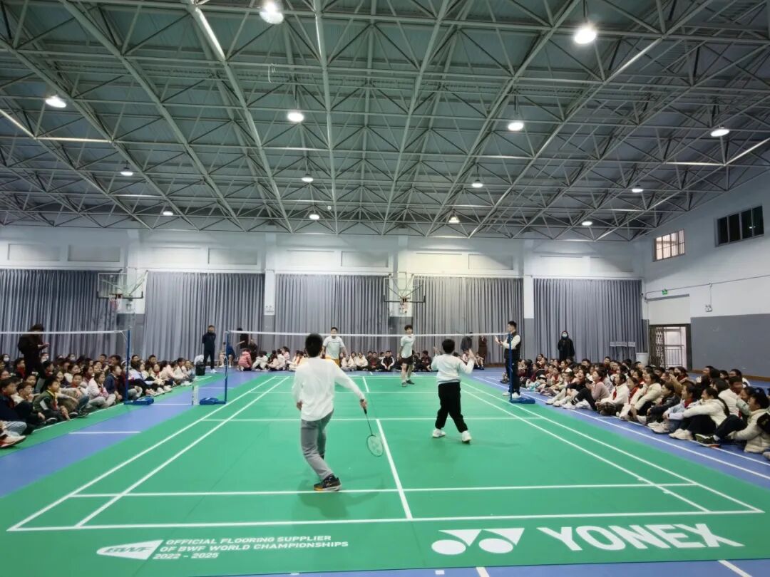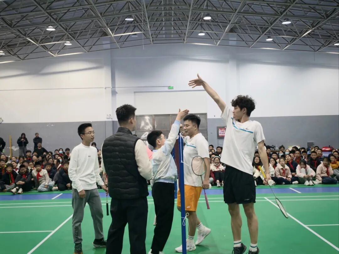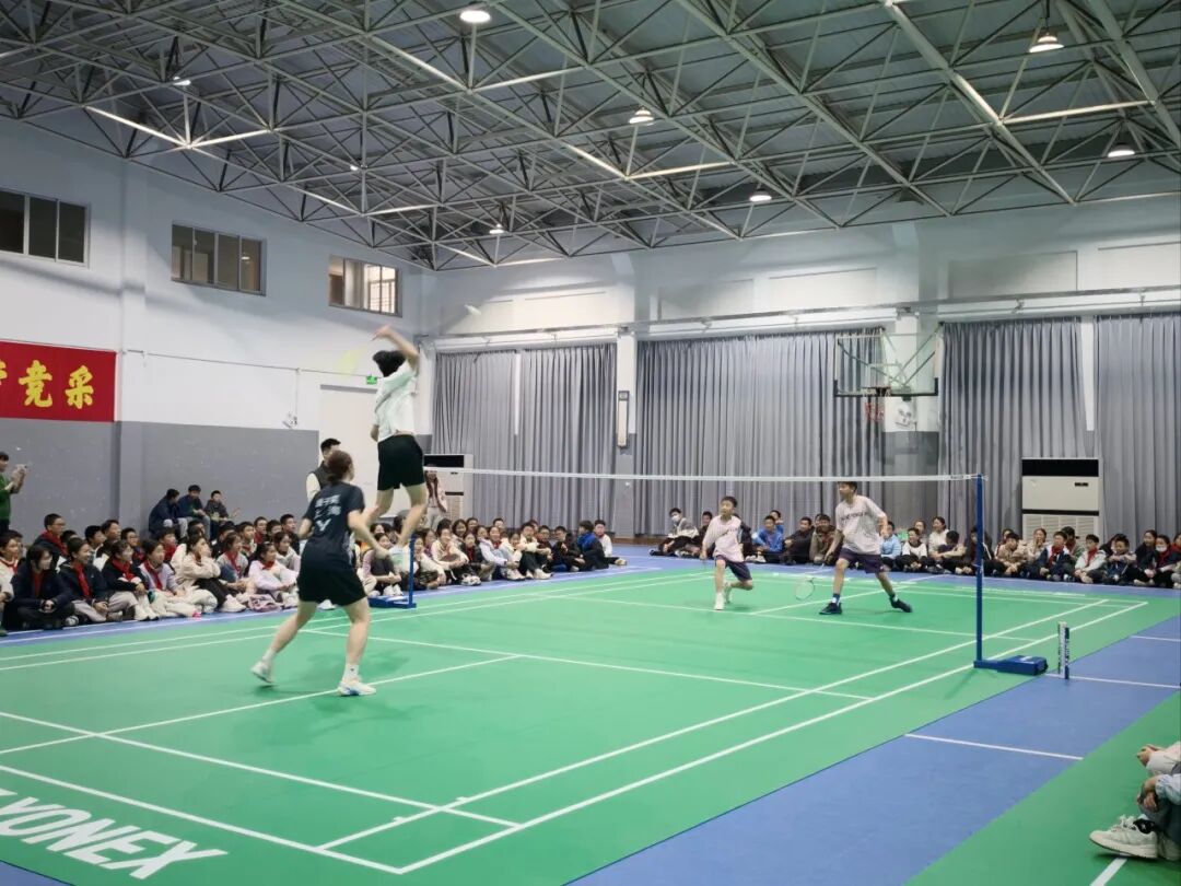 随后的表演赛环节,四位运动员联袂上演了一场精彩纷呈的趣味友谊赛。精准的扣杀、灵动的吊球、默契的配合,引得全场掌声与欢呼不断,也让同学们近距离感受到专业运动的魅力与激情。