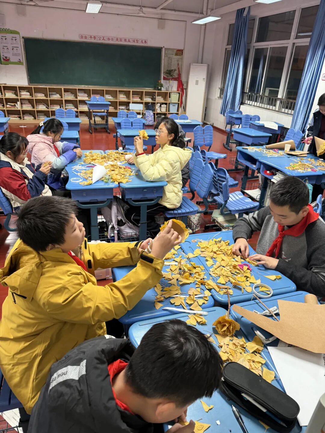 同学们以落叶为纸、毛线为笔