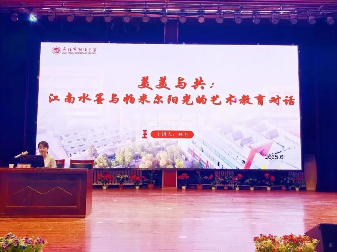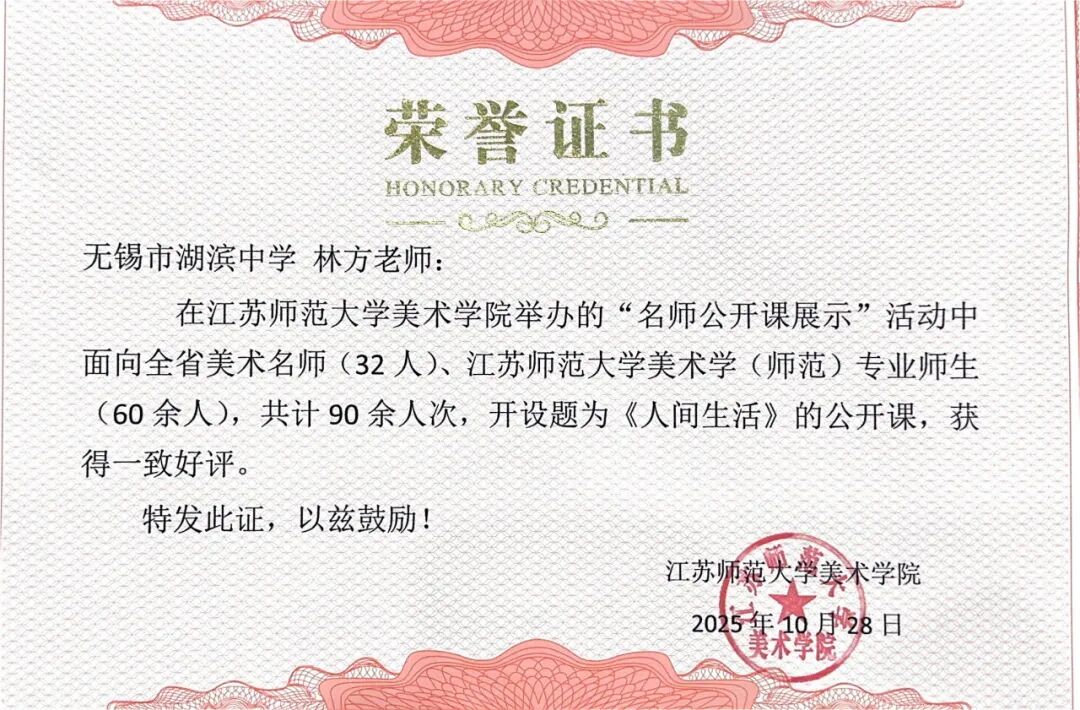 搭建高水平交流平台,鼓励教师在更广范围发声。面向全市成功举办“艺路无界·美育共生”美术公开课教学研讨活动,刘宁、鲍子杰等八位教师分学段展示特色课堂,体现扎实教学功底与多元视野。同时,深度参与市级课程思政专题研讨会,朱光宇老师通过展示课提供“湖滨样本”。教师个人发展方面,李峥、王冰教师参与清华大学美育专题培训班、林方在江苏师范大学美术学院上示范课、范悦获市“精品课”一等奖,充分展现五星级学科组的专业影响力。