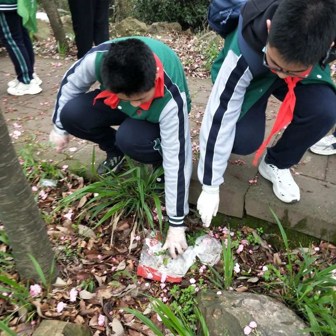 祭扫完毕,队员们又踏上环保之旅。山下枝叶扶疏,隐约看见亭台楼阁掩入树影。起初,大家步履轻盈,可随着时间的推移,队员们由健步如飞变得有些吃力,粗重的呼吸声在空气中无限放大。好在队员们并不轻言放弃,即使步履维艰,也互相搀扶着登上了山顶。放眼望去,白色的雾霭萦绕在山间,隐隐约约能看见山下的古镇。就着美景,队员们开始了清洁工作。大家两人一组,井然有序地开始了劳动。蜿蜒的山径随处可见同学们认真清扫的身影,没过多久所到之处就焕然一新。