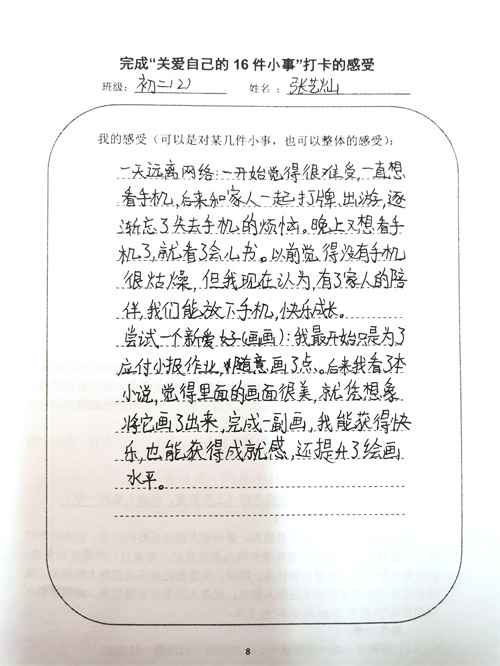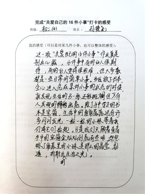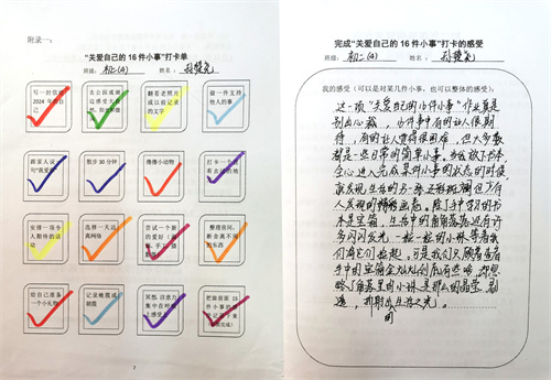 大多数时候我们被要求要照顾别人和在意他人的感受,但是却忽视了学会关爱自己也同样重要。关爱自己意味着积极地肯定自己、尊重自己的感受和需求,以及努力发掘自己的潜力和优点。同时,关爱自己也是关爱他人的前提,通过关爱自己能够更好地关注他人需求,促进人际关系和谐发展。假期里同学们积极完成关爱自我16件小事打卡,事虽小,感受却深。