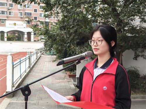 高二(3)班虞飞扬同学在国旗下讲话中回顾了祖国的发展历程,号召全校师生携手共进,为实现湖滨中学的美好梦想和祖国的伟大复兴而努力奋斗。
