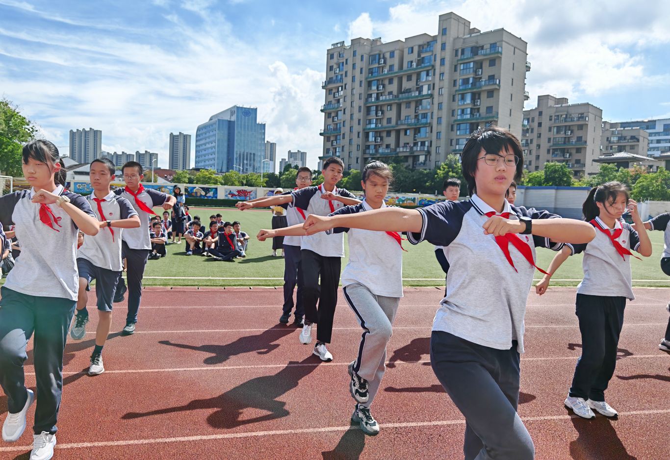 这整齐划一的背后,是无数个课余时间的刻苦练习,是同学间相互纠正、彼此鼓励的深厚情谊。这一刻,个人的努力汇聚成集体的光芒,那份为班级荣誉而战的团结与拼搏精神,比当空的骄阳更加耀眼。