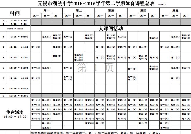 2015-2016学年第二学期体育课程总表